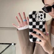 白黒 チェック模様 モコモコ 秋冬iPhoneケース カメラ全カバー iPhoneケース オシャレ jms23090603