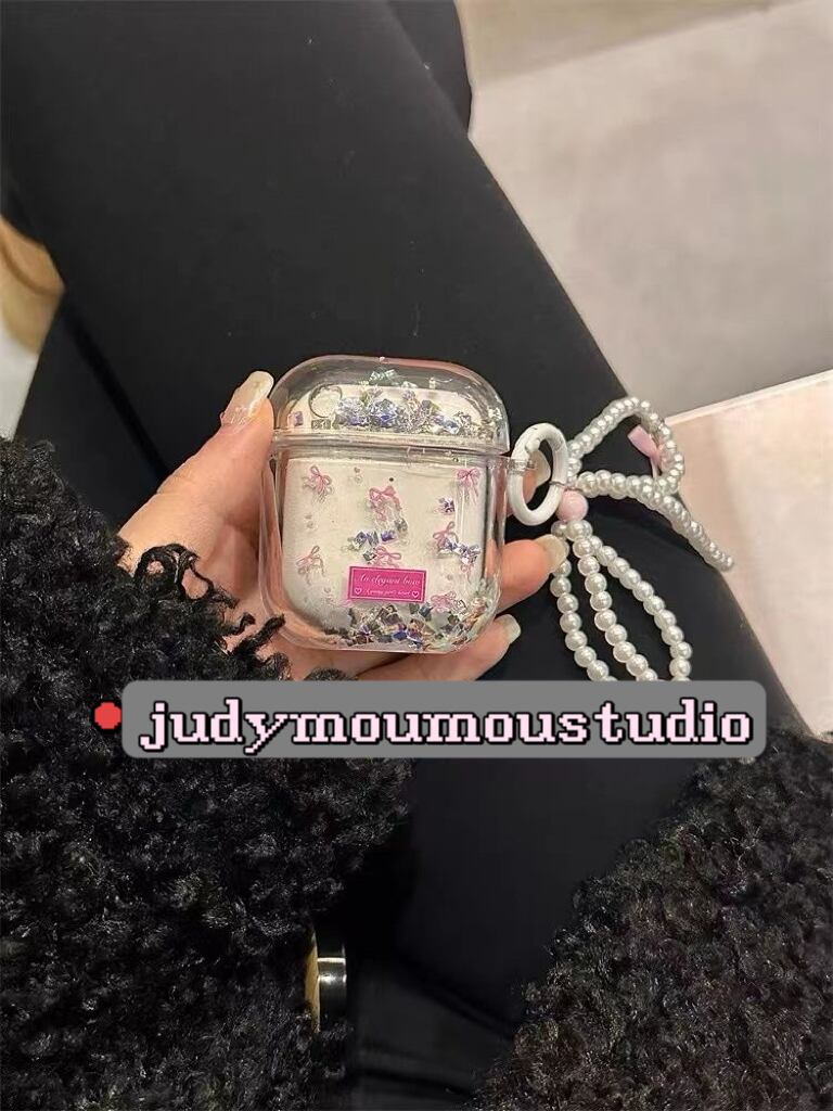 パールストラップ付き リボン クリアキラキラairpodsケース エアポッツケース エアポッツプロケース iPhoneケース jms24040801801