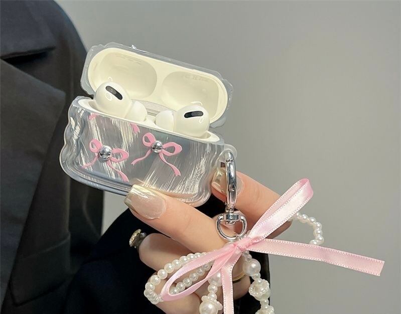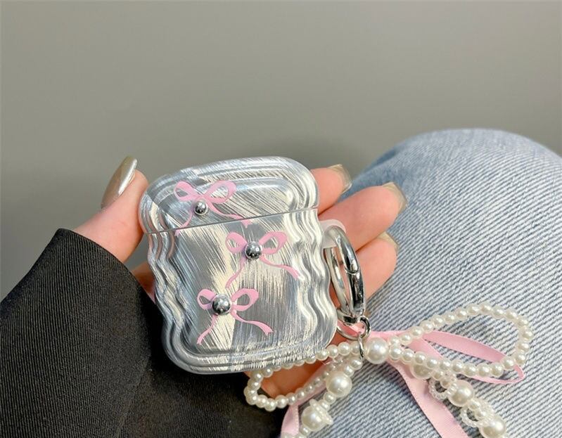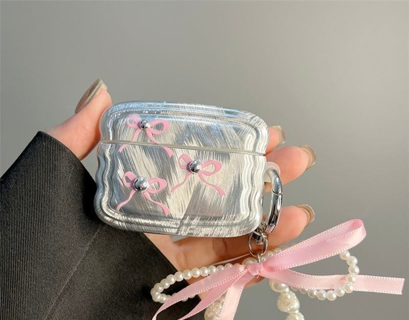 シルバーリボンストラップ付き airpodsケース エアポッツケース エアポッツプロケース iPhoneケース jms24071701
